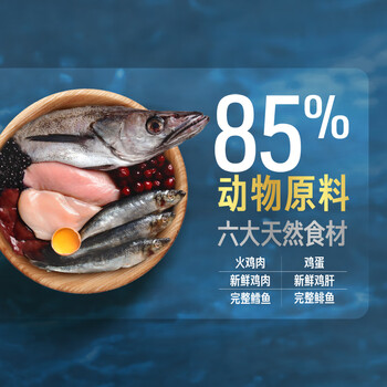 新鲜鸡肉(25%)、冷冻火鸡肉(9%)、完整鲱鱼(7%)、新鲜鸡肝(7%)、完整鳕鱼(5%)鸡蛋(5%)