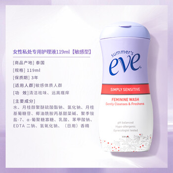 商品名称:夏依Summer's Eve女性专用洗液(敏感肌肤型) 规格参数:119ml 保质期:3年 储存方法:避光保存,恒温/恒湿