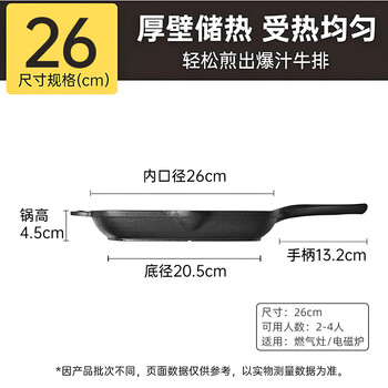 炊大皇牛排煎锅 平底锅健康无涂层厚铸铁煎盘牛扒盘电磁炉通用26cm