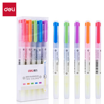 得力6色荧光笔 双头双色学生考试复习划重点标记马克笔记号笔 办公手账5 支/盒S619