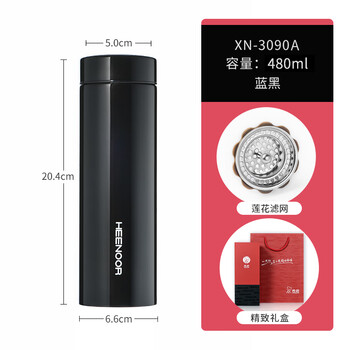 型号:XN-3090A 颜色:蓝黑色 容量:480ML 材质(杯身):316L不锈钢 尺寸:杯底直径66mm,杯口直径50mm,高204mm 净重量:0.24kg 保温时间:6~12小时 是否有茶隔:有