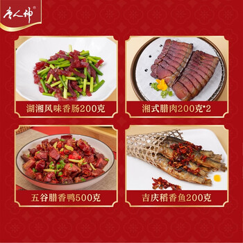 湘式手工香肠400g*1、湘式腊肉200g*2、湖湘风味香肠200g*1、凤凰盏香肠150g*1、吉庆稻香鱼200g*1、鸿运猪金鼎200g*1、玲珑腊猪心200g*1、五谷腊香鸭500g*1、五谷腊香鸡500g*1