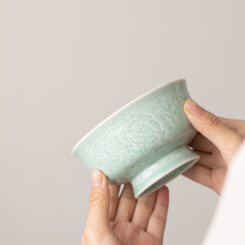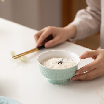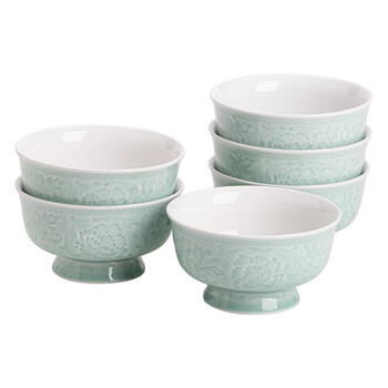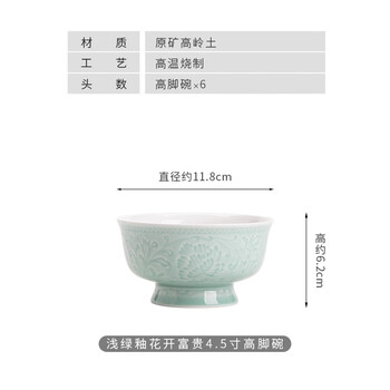 苏氏陶瓷青瓷花开富贵高脚米饭汤碗4.5英寸六个装
