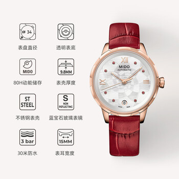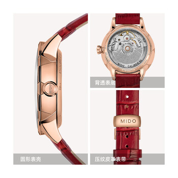 美度(MIDO)瑞士手表 花淅系列 复古红 长动能 时尚优雅 机械皮带女表