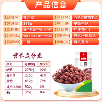 燕之坊红皮花生米 355g 一级生花生仁 东北五谷杂粮粗粮粥料原料 真空装