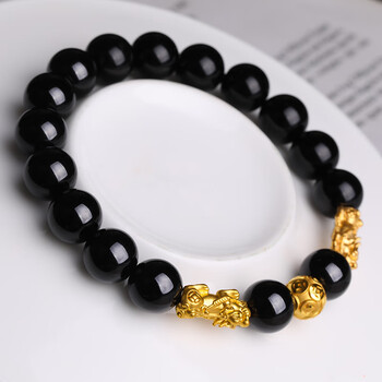 石玥珠宝精品10mm天然黑曜石手串黄金貔貅转运珠水晶手链男女士款礼物