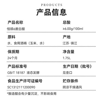 恒顺白醋 6度 1.75L 凉拌提味炒菜腌制 清洁除垢 多用途