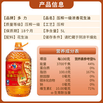 多力【保真花生油】压榨一级浓香花生油5L 食用油 年货热卖粮油