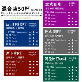 蓝山口味滤泡式咖啡8g*10、摩卡滤泡式咖啡8g*10、哥伦比亚滤泡式咖啡8g*10、巴西滤泡式咖啡8g*10、意式滤泡式咖啡8g*10