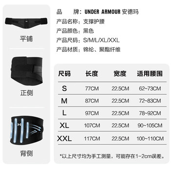 安德玛(Under Armour)护腰带保暖收腹带 跑步健身男女护具腰垫支撑腰托腰封 黑色S码