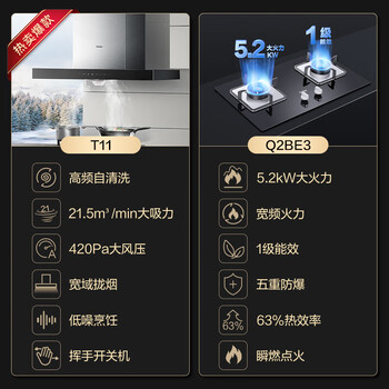 海尔(Haier)抽油烟机 顶吸欧式21.5m3/min大吸力 挥手智控自清洁 油烟机灶具套装T11+Q2BE3(天)【套装商品】