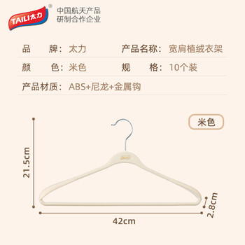 太力衣架植绒布衣柜衣架无痕宽肩防滑衣撑子大衣衣服架子米色10只