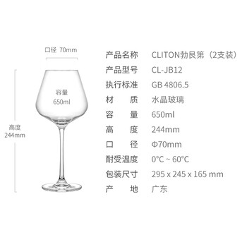 CLITON红酒杯高脚杯 家用水晶玻璃杯 葡萄酒杯勃艮第酒杯酒具套装2只装