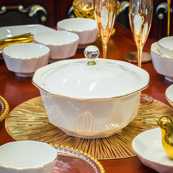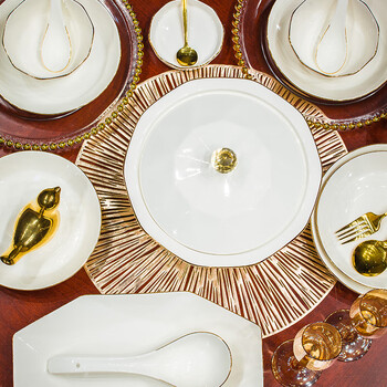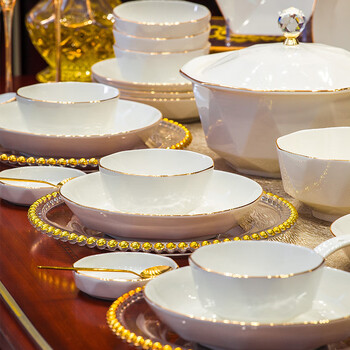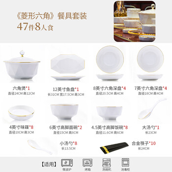 4.5英寸饭碗*8,6英寸面碗*2,8英寸深盘*4,8英寸浅盘*4,6角钻石煲*1,鱼盘*1,味碟*8,大勺*1,小勺*8,筷子*10