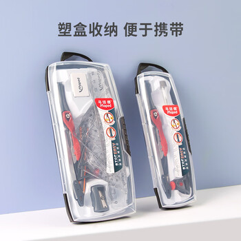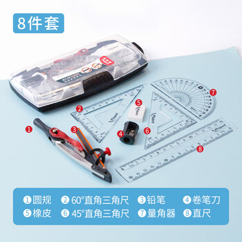 圆规*1;铅笔*1;卷笔刀*1;橡皮擦*1;60°直角三角尺*1;45°直角三角尺*1;量角器*1;直尺*1