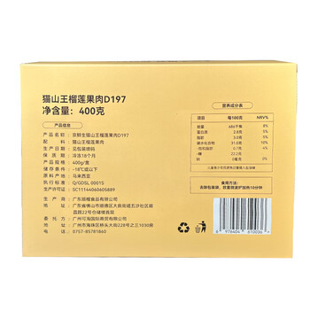 京鲜生马来西亚进口D197冷冻新鲜猫山王榴莲果肉 400g 低温水果年货礼盒