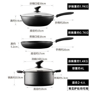 30cm炒锅*1,26cm煎锅*1,22cm汤锅*1,蒸屉*1,铲子*1,防烫夹*1