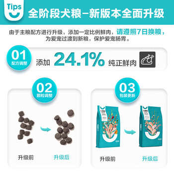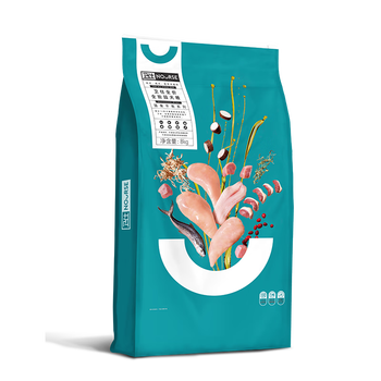 鲜鸡肉24.1%、鸭肉粉23.2%、红薯粉、马铃薯淀粉、冻鸡肉7.9%、鸡肝水解物、鱼粉1.5%、酒酵母粉1.5%、鱼(冻沙丁鱼0.4%、冻金枪鱼0.4%、冻三文鱼0.4%)1.2%、菊糖0.8%、鱼油0.8%、鸡肝粉、纤维素0.8%、喷雾干燥鸭血球蛋白粉、亚麻籽油、蔓越莓粉、苹果粉、胡萝卜粉、高丽菜粉、南瓜粉、番茄粉