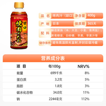 大逸昌 日本进口 甘口微甜烤肉汁 日式料理烤肉调味酱烧肉汁 蘸酱400g