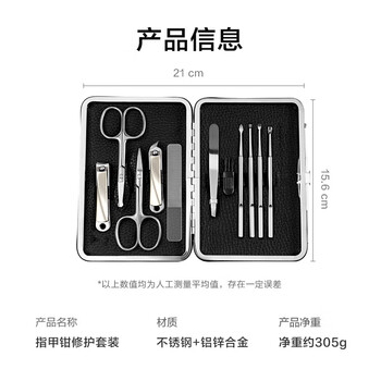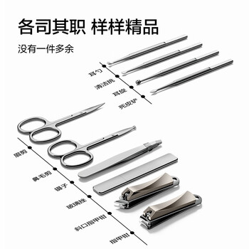 平口指甲钳*1、斜口指甲钳*1、鼻毛剪*1、眉剪*1、镊子*1、死皮铲*1、耳勺*1、耳旋*1、清洁挑*1、纳米玻璃挫*1、眉刀*2、清洁刷*1