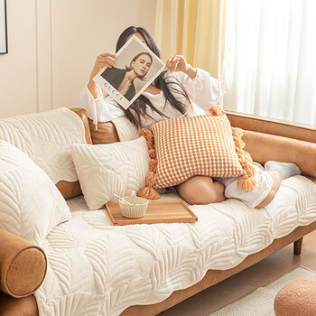 艾薇 沙发垫坐垫冬牛奶绒沙发套罩巾盖布防滑飘窗垫90*210芭蕉叶米白