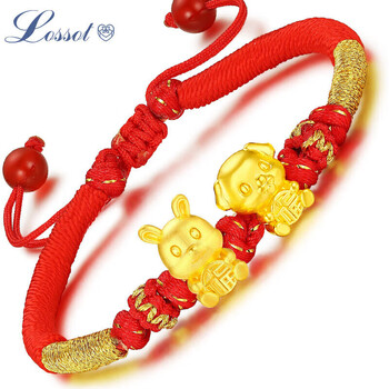 Lossot足金六合兔狗生肖黄金手链男女款5D硬金转运珠编织红绳本命年手链