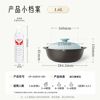 小熊(Bear)砂锅 宽口煲仔饭小炖锅耐高温不开裂1.6L 鸡公煲陶瓷锅G0054-S01