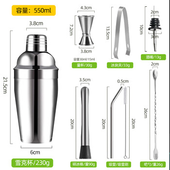 雪克杯*1 碎冰棒*1 量杯*1 酒嘴*1 吧勺*1 冰夹*1 吸管*1 吸管刷*1