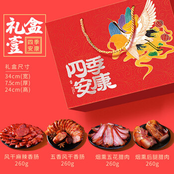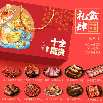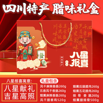 礼盒,烟熏麻辣香肠x1,风干麻辣香肠x1,五香味香肠x1,烟熏五花腊肉x1,烟熏后腿腊肉x1,风干鸡x1,烟熏排骨x1,排骨香肠x1