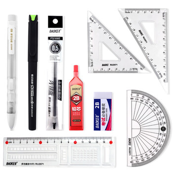 中性笔×1,笔芯×1,铅笔×1,铅芯×1,橡皮×1,套尺(直尺,直角三角尺,等腰三角尺,量角器)×1