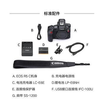 EOS R5 C机身×1、电池充电器 LC-E6E(含电源线)×1、锂电池 LP-E6NH×1、USB接口连接线IFC-100U×1、连接线保护器×1、肩带SS-1200×1