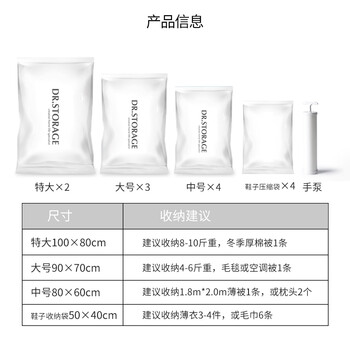 简约白15件套【品牌】:收纳博士(Dr.storage) 【清单】:特大号:100*80cm X 2;大号:90*70cm X3;中号:80*60cm X4; 鞋子压缩袋50*40cm X4:手泵:1个,PLUS 电泵,滑片:2-4个 【压缩对象】:被子、衣物、鞋子、毛绒玩具等 【功能】:防潮、防尘、防霉