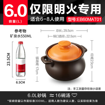 苏泊尔(SUPOR)砂锅煲汤锅炖锅6.0L养生煲耐高温不开裂陶瓷煲