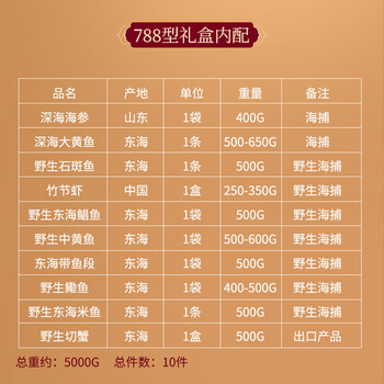 深海海参400g*1 深海大黄鱼500g*1 石斑鱼500g*1 红虾(可用竹节虾代替)250g*1 东海鲳鱼500g*1 中黄鱼500g*1 东海带鱼段500g*1 鳓鱼400g*1 东海米鱼500g*1 切蟹500g*1