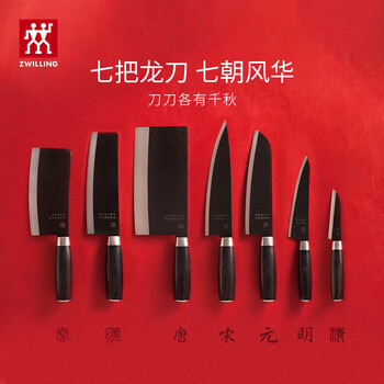 汉刀/迷你厨刀*1、宋刀/主厨刀*1、元刀/多用刀*1、明刀/小切片刀*1、清刀/蔬菜刀*1、秦刀/中式砍刀*1、唐刀/中厨刀*1、刀架*3