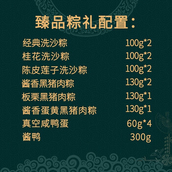 经典洗沙粽100g*2 桂花洗沙粽100g*2 陈皮莲子洗沙粽100g*2 酱香黑猪肉粽130g*2 板栗黑猪肉粽130g*1 酱香蛋黄黑猪肉粽130g*1 真空咸鸭蛋60g*4 真空酱鸭300g*1袋