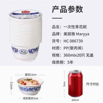 美丽雅 一次性小碗360ml*20只 青花塑料餐盒食品级汤圆米饭冰粉碗不带盖