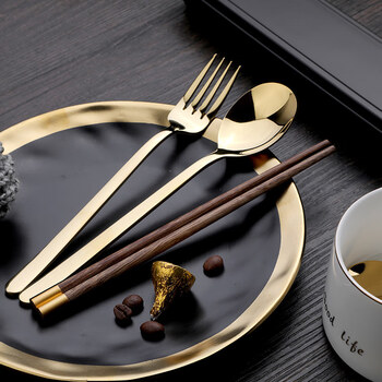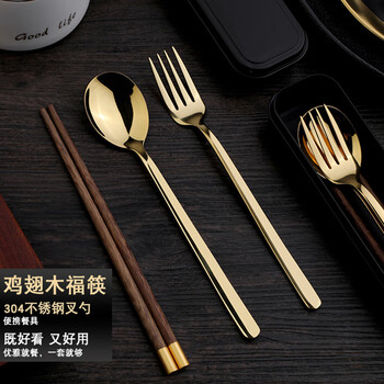 拾画304不锈钢勺子叉子鸡翅木筷子四件套装 学生成人旅行盒装便携餐具