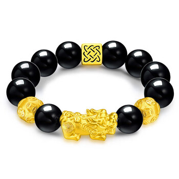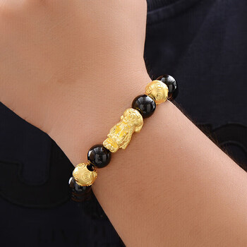 蒂蔻(Tico)足金大气招财貔貅黄金手链男3D硬金转运珠黑玛瑙手串生日礼物