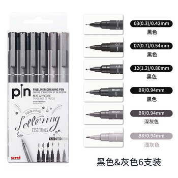 uni三菱 水性绘图针管笔 PIN-200美术漫画设计描边描线笔勾线笔 黑色/深灰/浅灰 6支套装(brush3支)