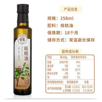 帝麦核桃油258ml 物理冷榨 适用于儿童宝宝孕妇食用油热门商品