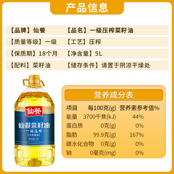 仙餐牌食用油 四川压榨 一级压榨非转基因菜籽油 5L