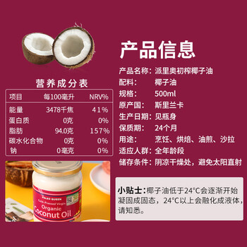 派里奥(Paleo queen)有机冷榨椰子油500ml 斯里兰卡进口烘焙咖啡烘焙漱口护发食用油