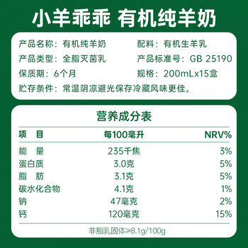 小羊乖乖 有机纯羊奶200ml*15盒 纯正山羊奶 儿童成人高钙早餐 送礼盒装