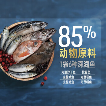 完整沙丁鱼(18%)、完整蜻鱼(12%)、完整鳕鱼(11%)、比目鱼(5%)、完整岩鱼(5%)、完整鳎鱼(5%)、鲭鱼粉(5%)、鲱鱼粉(5%)、白鱼粉(5%)