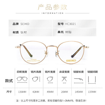精工(SEIKO)眼镜框男女款全框钛材商务休闲近视眼镜架HC3021 01 49mm金色