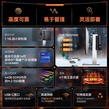 戴尔(DELL)OptiPlex7020MFF商用办公迷你台式电脑主机i7-14700T/32G/1T固态/集显+23.8英寸显示器定制