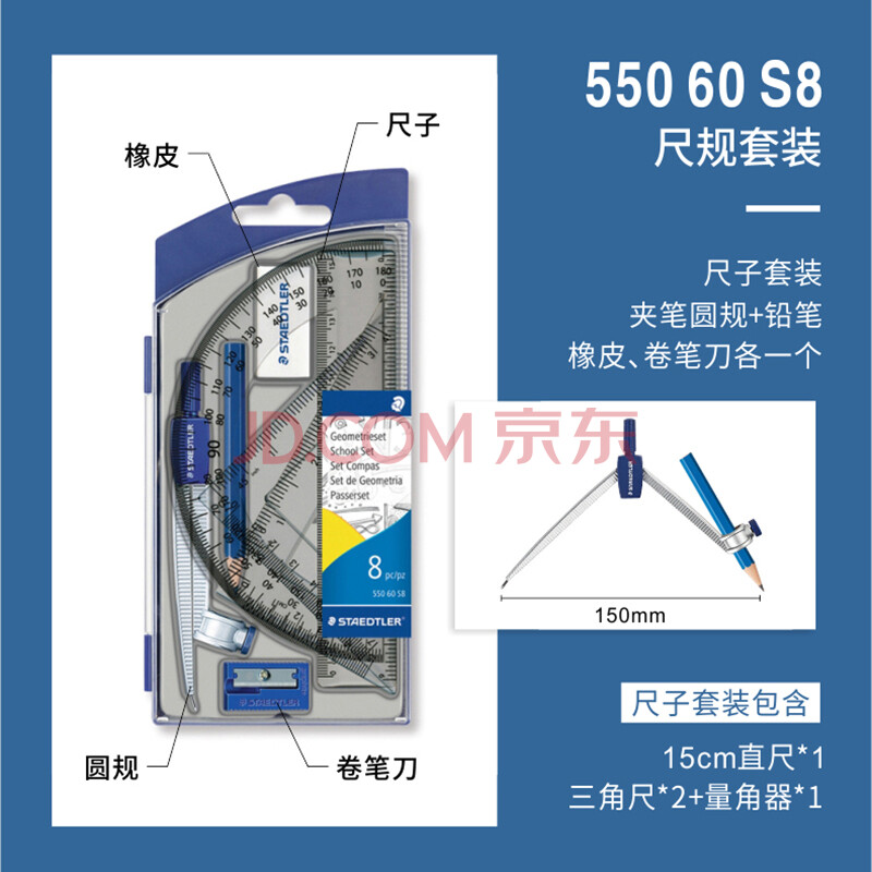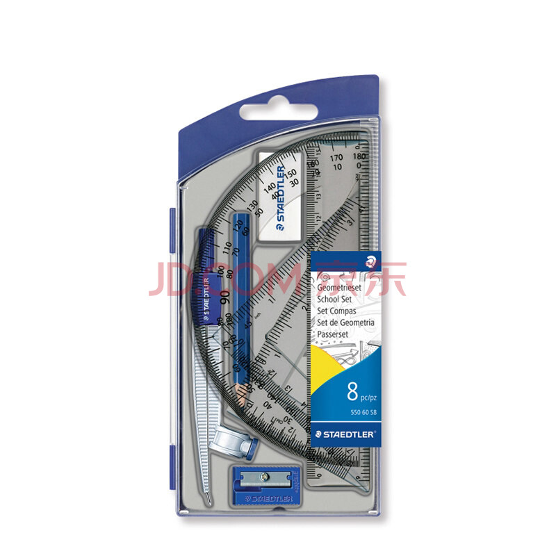 商品相册:施德楼(STAEDTLER)圆规套装 小学初中高中生考试绘图尺规8件套(圆规+卷笔刀+橡皮+铅笔+直尺三角尺量角器)55060S8第