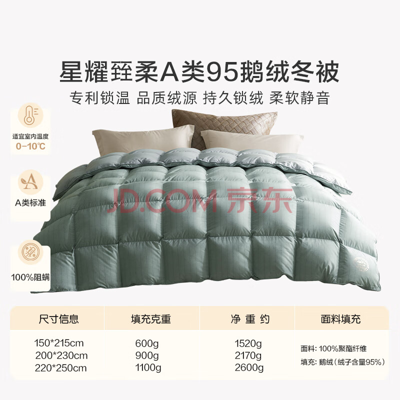 商品相册:罗莱家纺 羽绒被 A类95%水洗鹅绒被子保暖冬被芯 约5.2斤绿第