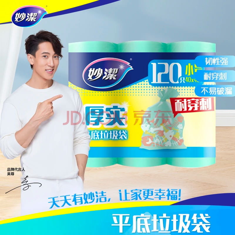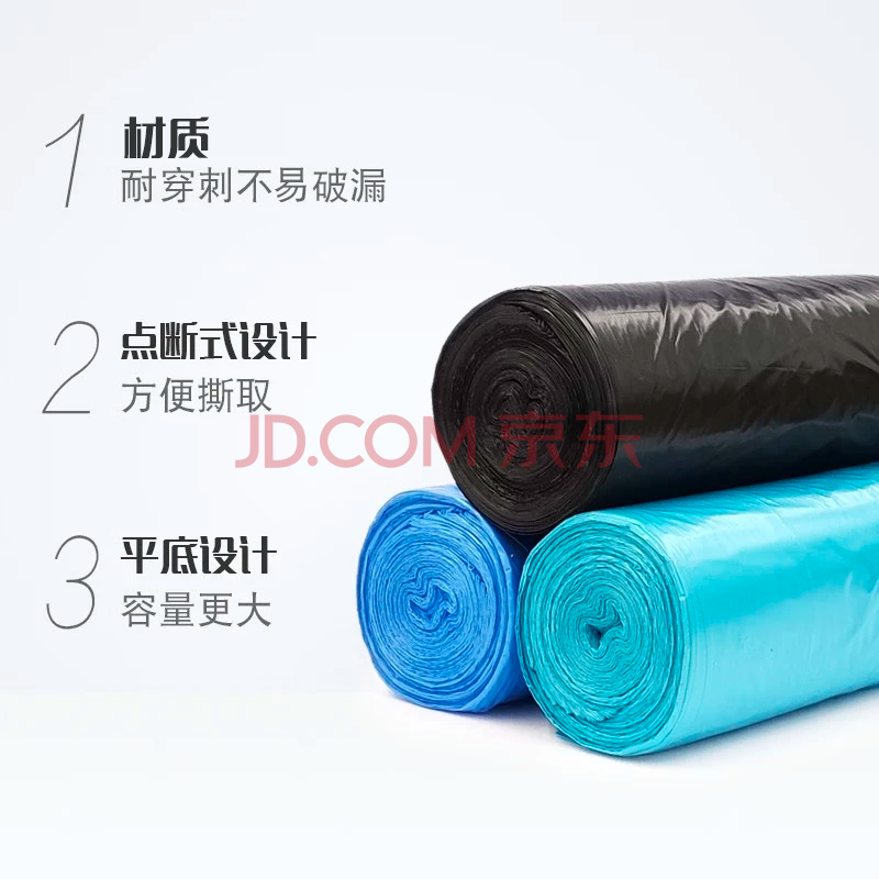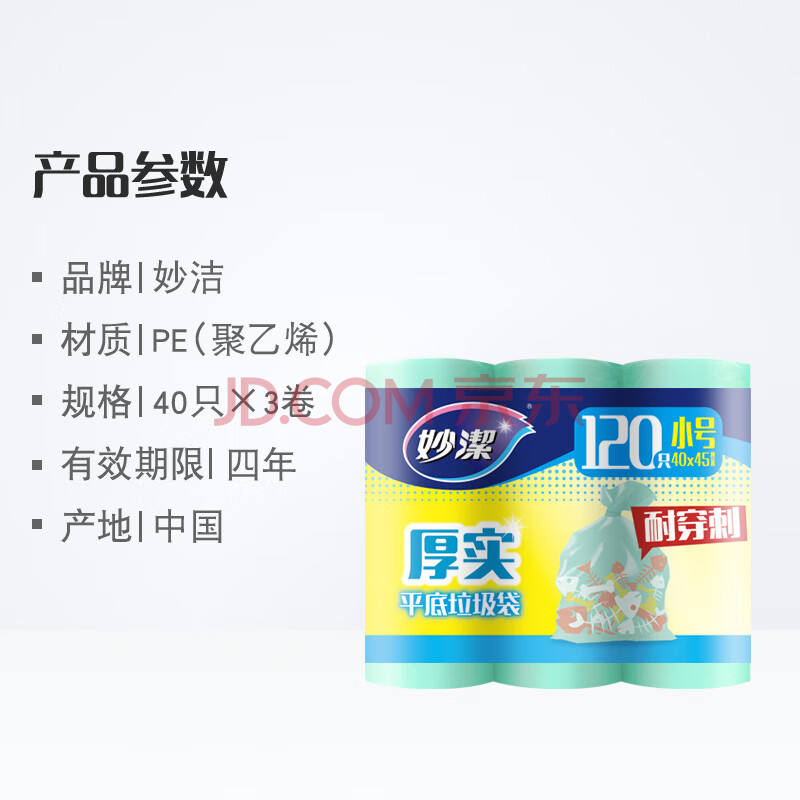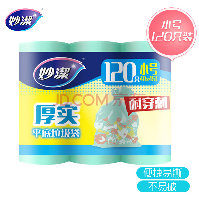 商品相册:妙洁平口垃圾袋青色40*45cm120只单面0.8丝点断式小号新老包装随机发第